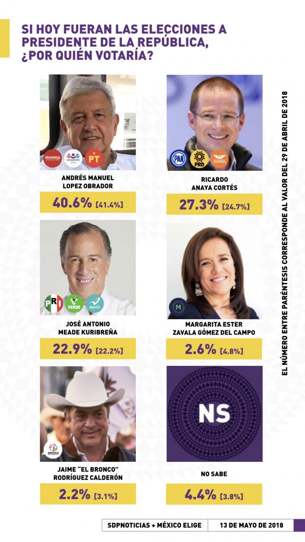 A 49 días de la elección se observa una relación inversamente proporcional entre Ricardo Anaya y Margarita Zavala; mientras el candidato de la coalición Por México al Frente pasa de 24.7 a 27.3 por ciento, la candidata independiente continúa en caída libre, al pasar de 4.8 a 2.6 por ciento.